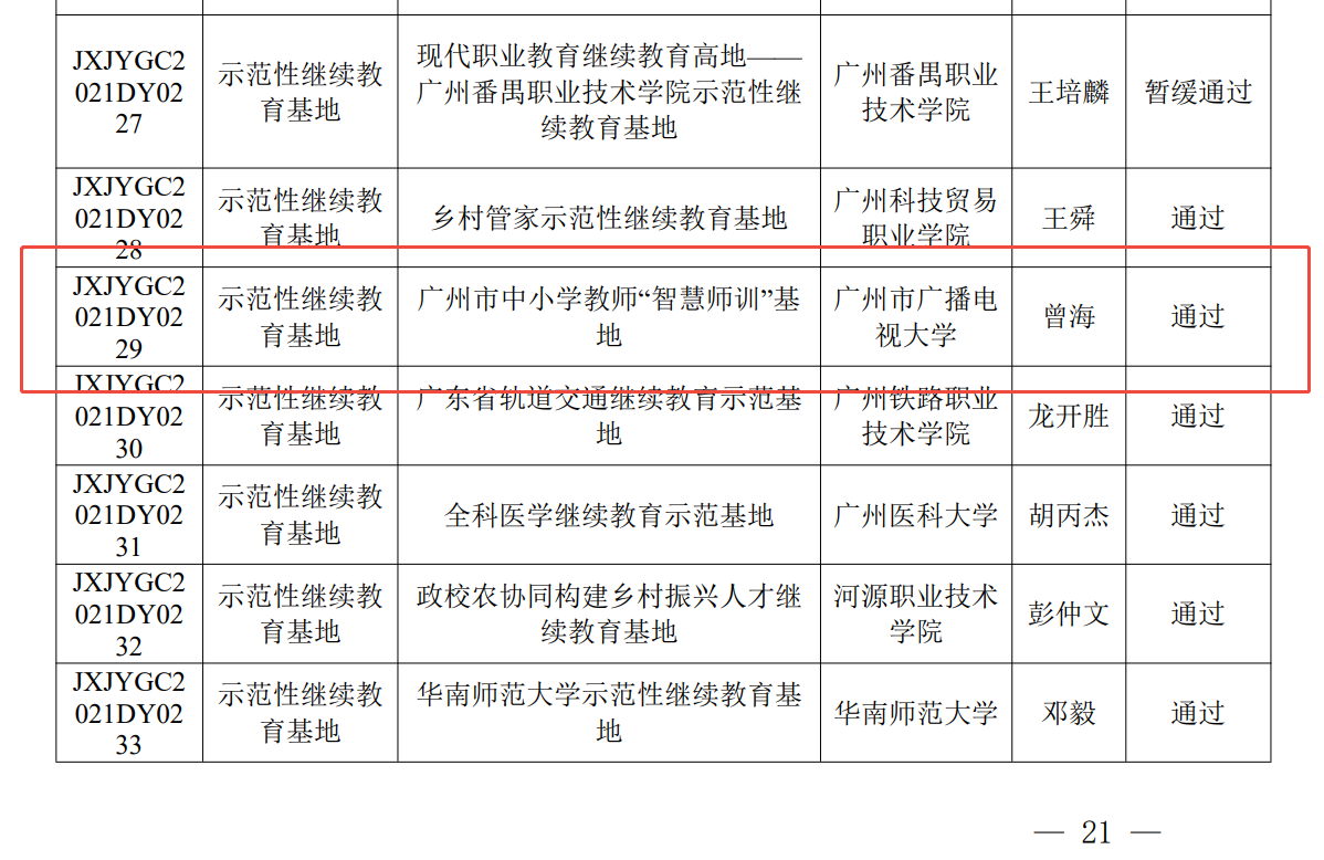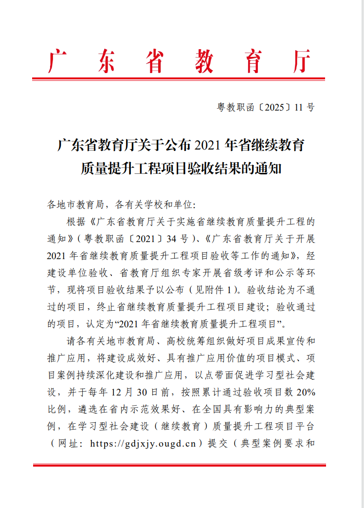 4月2日 午夜在线小视频,广东省教育厅发布了《广东省教育厅关于公布 2021 年省继续教育质量提升工程项目验收结果的通知》(粤教职函〔2025〕11 号),经建设单位验收,省教育厅组织专家开展省级考评和公示等环节,我校两个项目(具体名单附后)顺利通过验收,被认定为“2021 年省继续教育质量提升工程项目”。