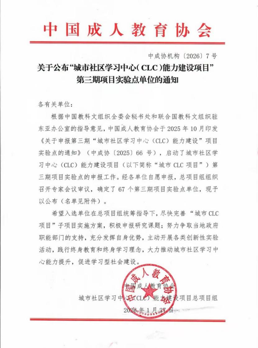 近日,中国成人教育协会公布“城市社区学习中心(CLC)能力建设项目”第三期项目实验点单位 午夜福利国产在线,本期有来自全国67个实验点单位入选,我校再次入选。